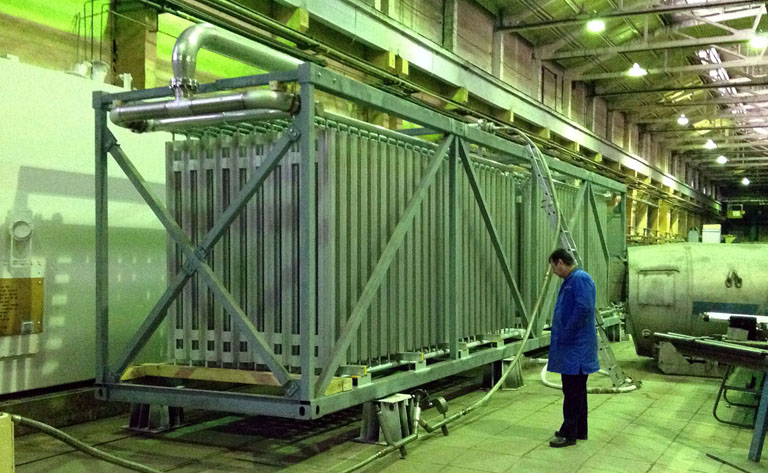 Уже в конце декабря 2013 года был изготовлен испаритель с площадью поверхности 1300 м2 с номинальной производительностью 4600 нм3/час по азоту в габаритах 40’ морского контейнера.