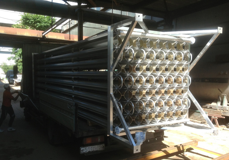 В настоящее время компанией «НПО Мониторинг» освоено производство атмосферных испарителей среднего (40 бар) и высокого (250 бар) давлений из продольно оребрённой алюминиевой и биметаллической труб, наружной оболочкой которых является алюминиевый профиль с развитой поверхностью теплообмена. Внутренняя труба испарителей высокого давления изготовлена из нержавеющей стали [2, 3].